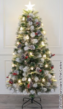 Crafted with a premium mix of PE snowy pine needles and PVC tips, the tree offers a full, realistic look with a luxurious snowy finish. At an impressive 210cm, it stands tall as the centrepiece of your seasonal décor, while the integrated fibre optic lights provide a sparkling display without the need for additional string lights.